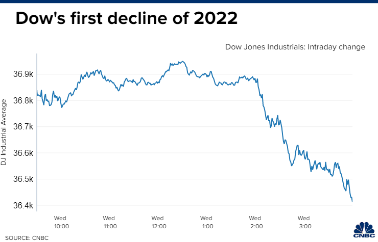 | | S&P 500 | | NAME | LAST | CHG | %CHG | | F | 23.66 | -0.65 | -2.67% | | T | 26.21 | +0.57 | +2.22% | | AAPL | 174.92 | -4.78 | -2.66% | | | | NASDAQ | | NAME | LAST | CHG | %CHG | | AAPL | 174.92 | -4.78 | -2.66% | | AMD | 136.15 | -8.27 | -5.73% | | INTC | 53.87 | +0.73 | +1.37% | | | | Stocks plunged Wednesday after the Federal Reserve released the minutes of its most recent meeting, showing the central bank may be more aggressive at removing stimulus. The Dow Jones Industrial Average fell 392.54 points, or 1.07%, for its first decline of the new year. The S&P 500 lost 1.9%, and the tech-heavy Nasdaq slid 3.34% for its biggest one-day loss since February. The Fed minutes showed officials are considering shrinking the balance sheet along with raising rates as one more way to remove policy accommodation. They also showed the Fed might be more aggressive in raising rates. The update by the Fed pushed the 10-year yield above 1.70%. Tech stocks were hit hardest as investors rotated from growth-oriented names to value and cyclical stocks. Salesforce and Adobe were among the top decliners in the S&P 500, falling about 8.2% and 7.1%, respectively. Losses in Microsoft and Apple weighed on the Dow. Chipmakers Nvidia and Advanced Micro Devices each fell more than 5%. Names linked to the reopening of the economy, which led market gains this week and into the earlier part of trading Wednesday, managed to stay positive despite the sea of red in the market. Pfizer was a winner, ending the day up 2% following an upgrade by Bank of America. |