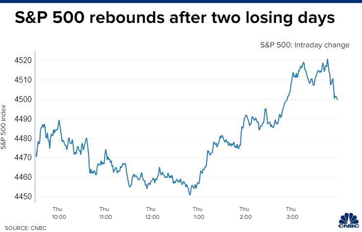 Stocks made a comeback Thursday afternoon, following two straight days of losses, as investors weighed the Federal Reserve's approach toward fighting inflation. Markets dipped into the negative early in the session but climbed back during afternoon trading. The Dow Jones Industrial Average ended the day up 0.25%, the S&P 500 advanced 0.43%, and the Nasdaq rose 0.06%. Investors continued to scout out stocks with stable earnings and dividends like consumer staples and health-care companies. Procter & Gamble, UnitedHealth Group and Walmart all ended the day in the green. |