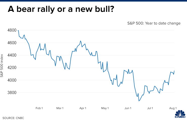 Stocks posted a rebound rally Wednesday, with the S&P 500 erasing losses from earlier in the week. All three major averages gained after economic data showed the services sector did better than expected in July. Investors seemed to shrug off fears that the U.S. is in a recession. St. Louis Federal Reserve President James Bullard reinforced this sentiment, saying on CNBC's "Squawk Box" that he does not think the U.S. is in a recession, citing job gains and low unemployment. Strategists are now debating whether the current gains in stocks are another bear market rally or are the start of a new bull market. |