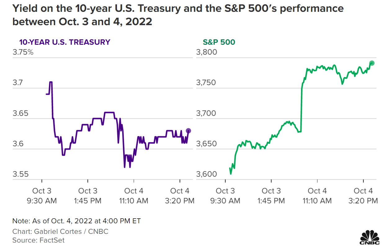 Stocks extended their gains for a second session on Tuesday as bond yields ticked lower and traders weighed the possibility of a rally from the recent 2022 lows. The major averages soared to start the day and maintained gains throughout the trading session. The Dow Jones Industrial Average jumped back over the 30,000 mark, while the S&P 500 posted its biggest two-day gain since March 2020. The Nasdaq Composite was the outperformer. Early on, the Bureau of Labor Statistics reported that job openings plunged by more than 1.1 million in August, providing a potential early sign that the U.S. labor gap may be narrowing. Also, the yield on the 10-year U.S. Treasury note inched downward Tuesday, and the dollar index retreated back to 110. |