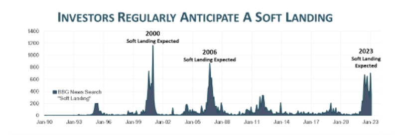 Previous actual soft landings, he adds, occurred when banks were easing lending standards as the Fed hiked rates, which is not the case now.