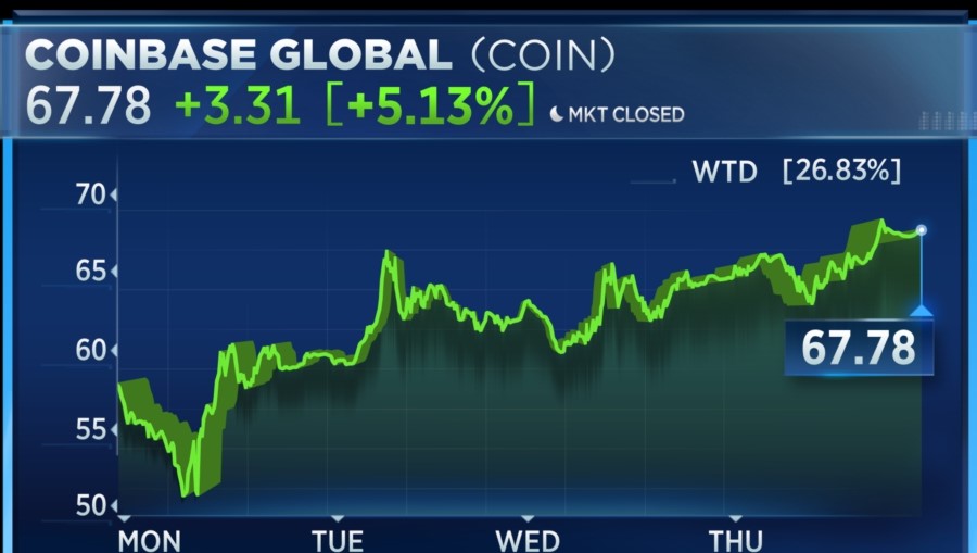 As crypto creeps back up this week, check out Coinbase. The stock is up 27% in four days, and it's up 5% today. Shares are down 61% in a year.